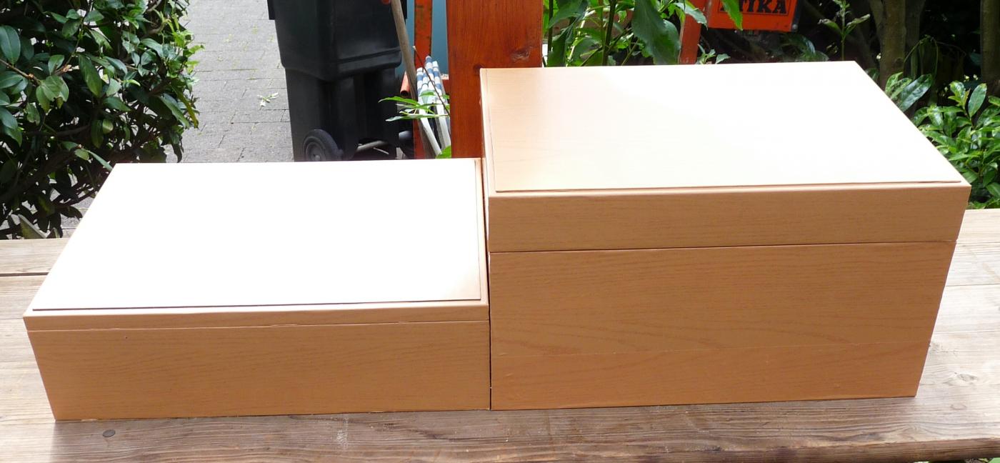 Das Furnier war nicht mehr zu retten und wurde entfernt und die Gehäuse foliert. Funktioniert.