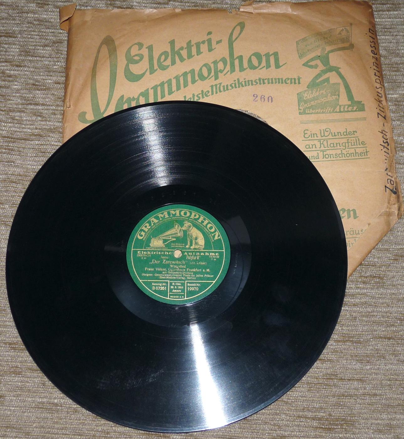 Gewaschene, gut erhaltene Grammophon Schellackplatte (1928) mit Original-Papierhülle (starke Gebrauchsspuren), Franz Völker, Opernhaus Frankfurt a. M. mit Orchesterbegleitung, Dirigent Generalmusikdirektor Professor Julius Prüwer - Die Zirkusprinzessin (E. Kalman); Der Zarewitsch (F. Lehar) |