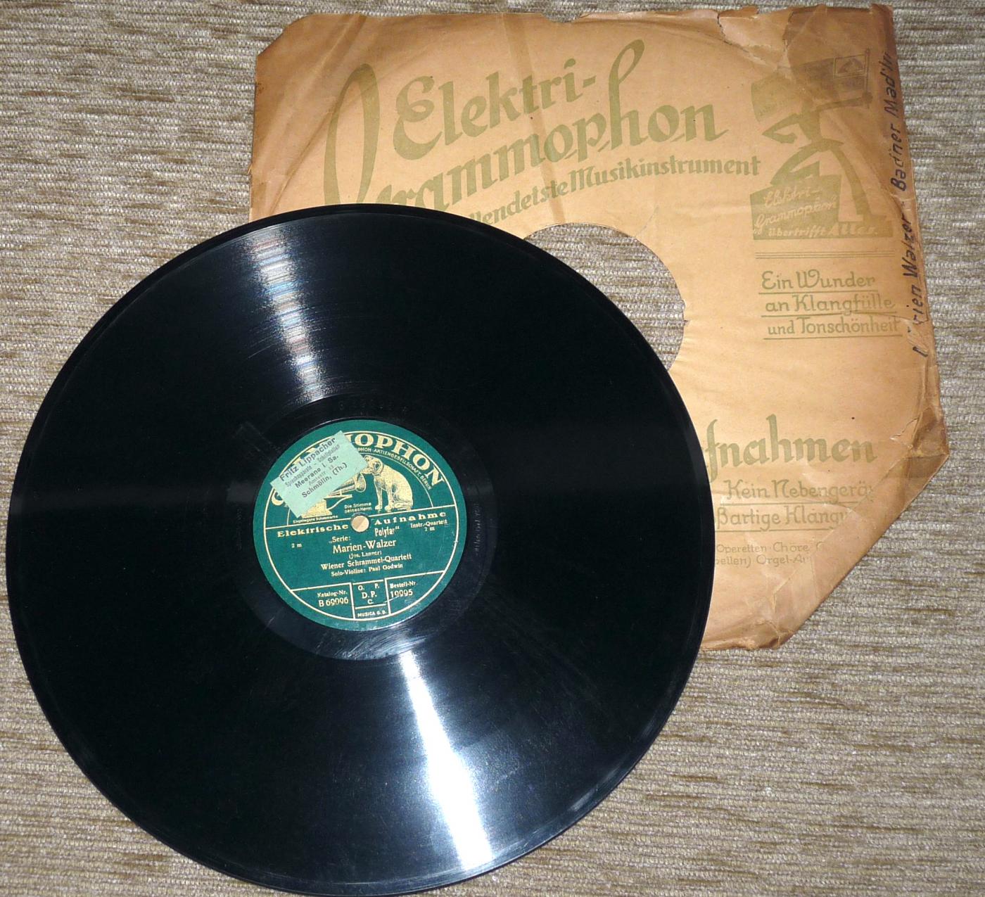 Gewaschene, gut erhaltene Grammophon Schellackplatte (1928) mit Original-Papierhülle (sehr starke Gebrauchsspuren), Wiener-Schrammel-Quartett (Violine Paul Godwin) - Marien-Walzer, Badner Madln |