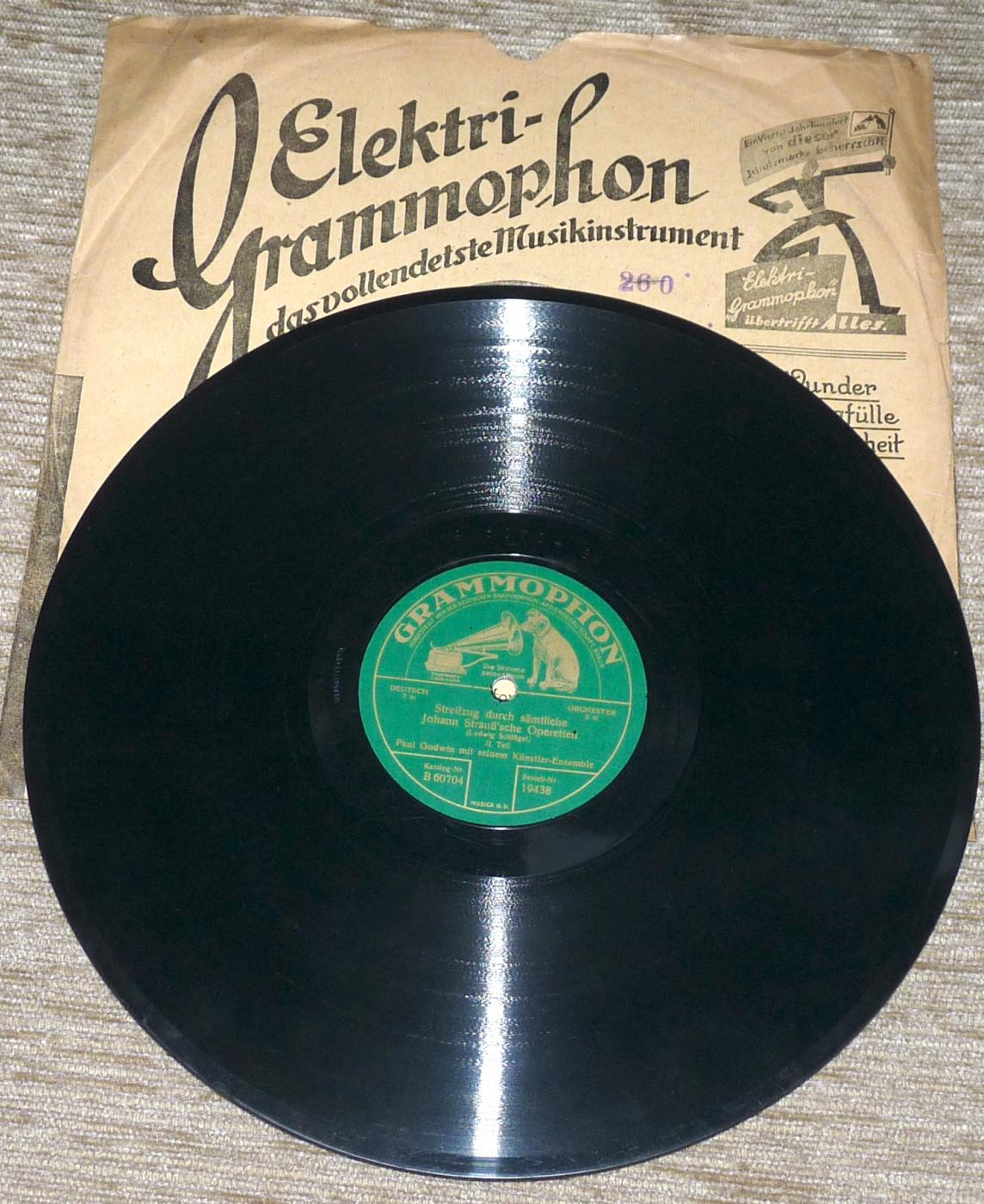 Gewaschene, gut erhaltene Grammophon Schellackplatte (1925) mit Original-Papierhülle (starke Gebrauchsspuren), Paul Godwin mit seinem Künstler Ensemble: Streifzug durch sämtliche Johann Strauß Operetten (2 Teile)