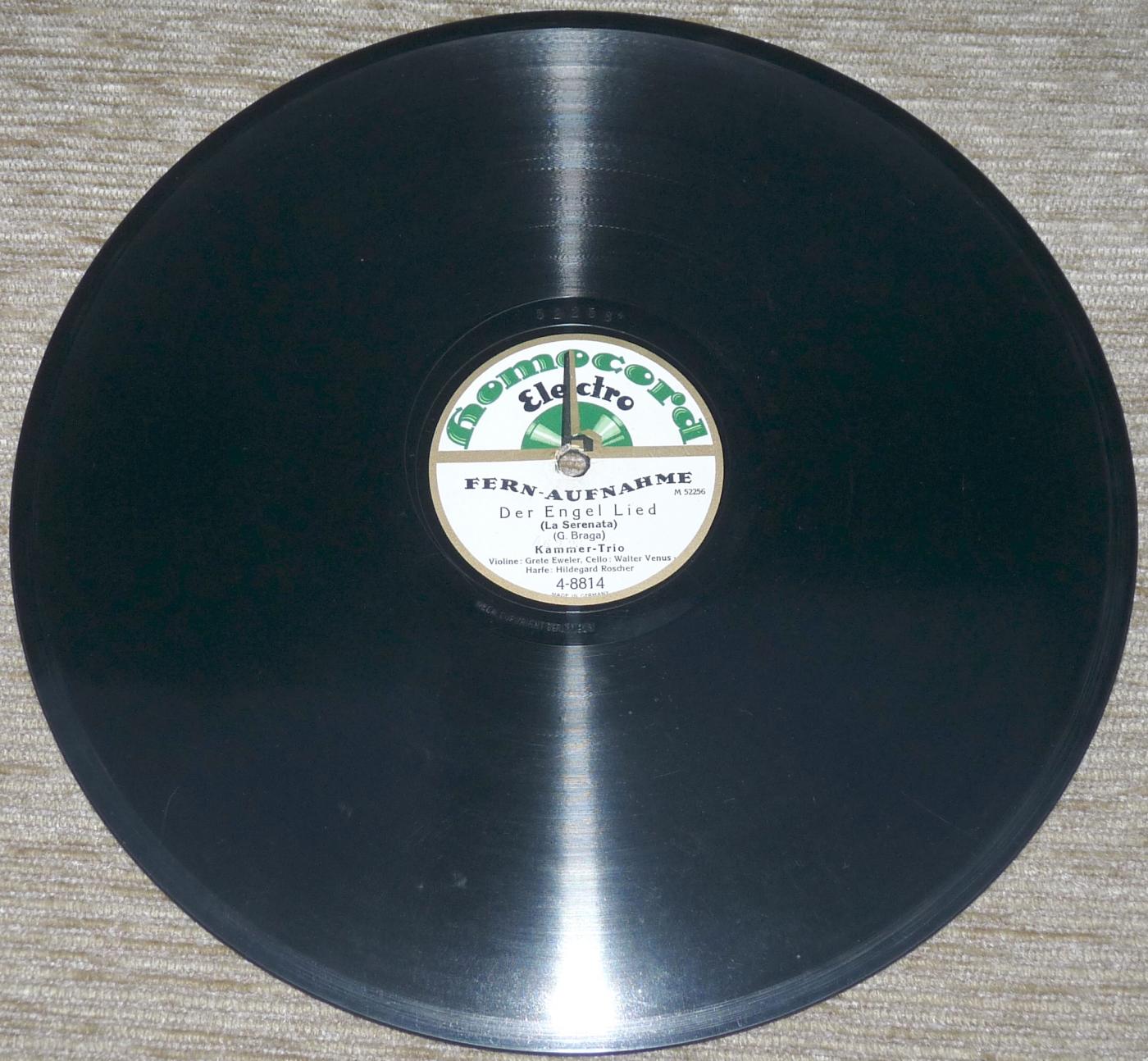Gewaschene, gut erhaltene Homocord Schellackplatte (1928) mit Ersatz-Papierhülle, Der Engel Lied; Legende - Kammer-Trio, Violine Grete Ewler, Cello Walter Venus, Harfe Hildegard Roscher. |