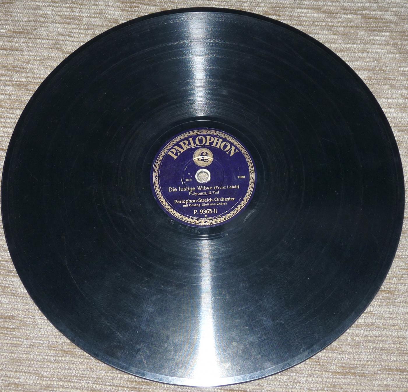 Gewaschene, gut erhaltene Parlophon Schellackplatte (1926) mit Ersatz-Papierhülle, Die lustige Witwe von Franz Lehar, Potpourri - Parlophon-Streich-Orchester.