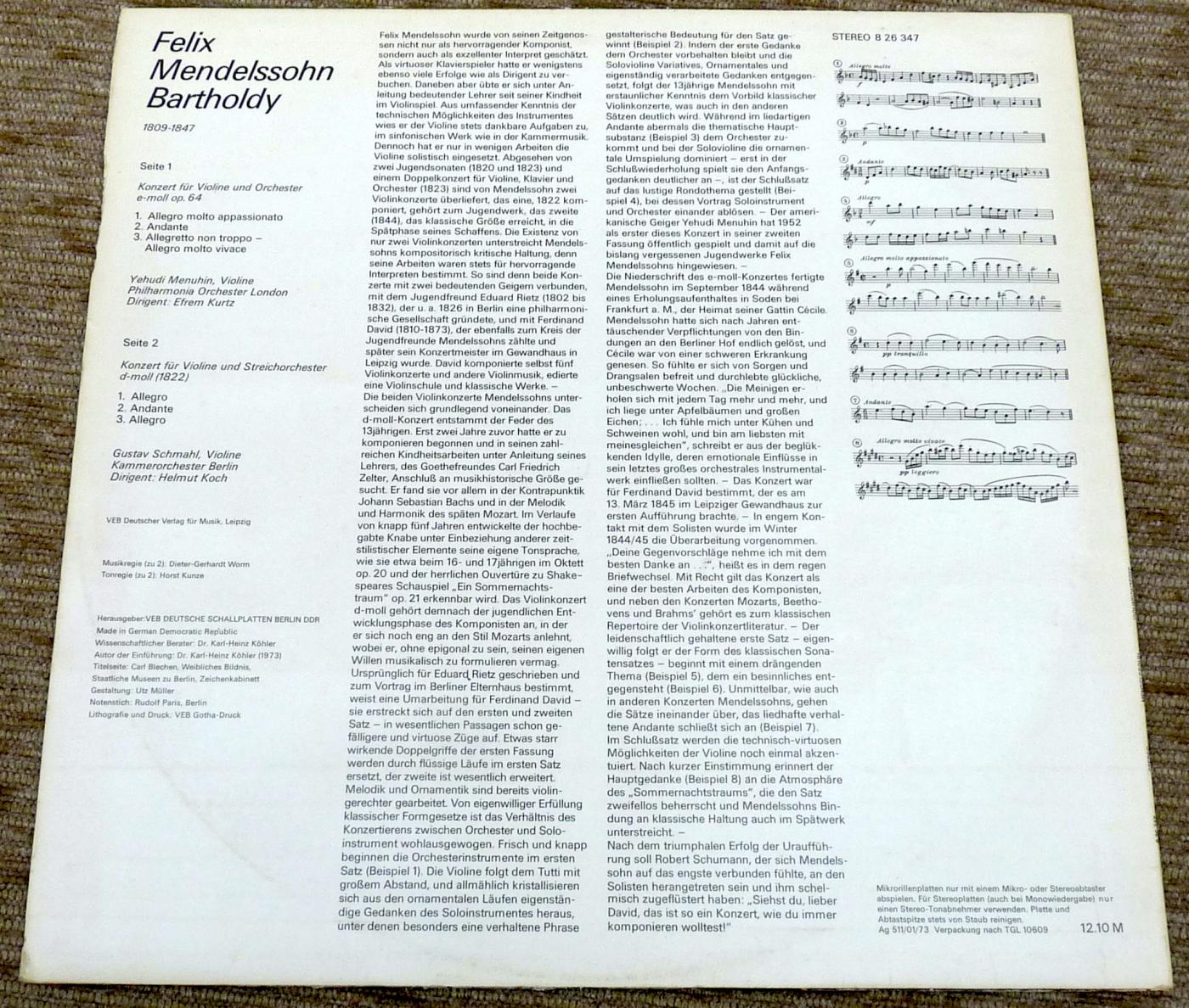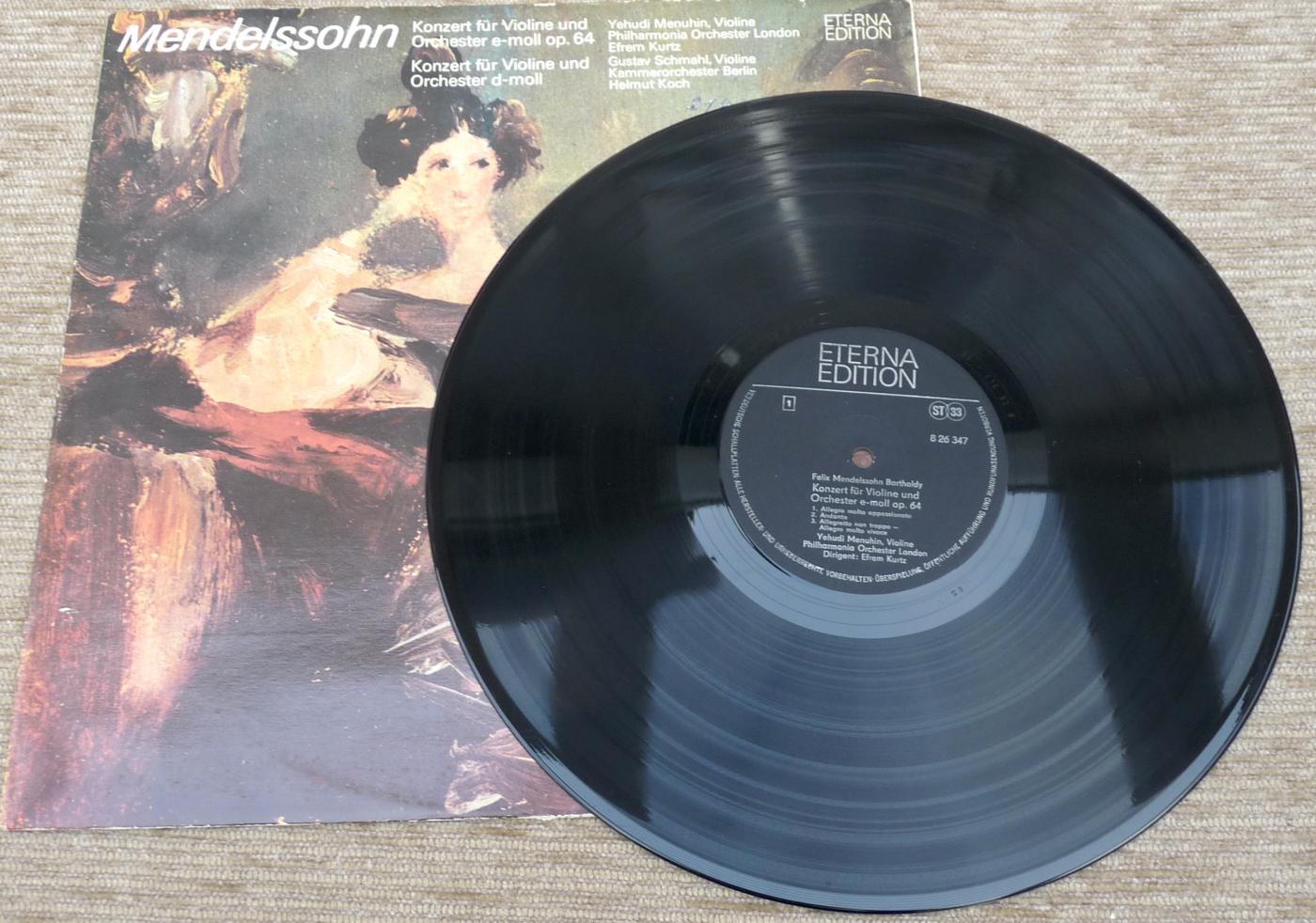 Gut erhaltene und gewaschene LP aus der DDR. Konzert für Violine und Orchester e-moll op.64 - Yehudi Menuhin, Violine, Philharmonia Orchester London, Efrem Kurtz; Konzert für Violine und Streichorchester d-moll (1822), Gustav Schmal, Violine, Kammerorchester Berlin, Helmut Koch. |