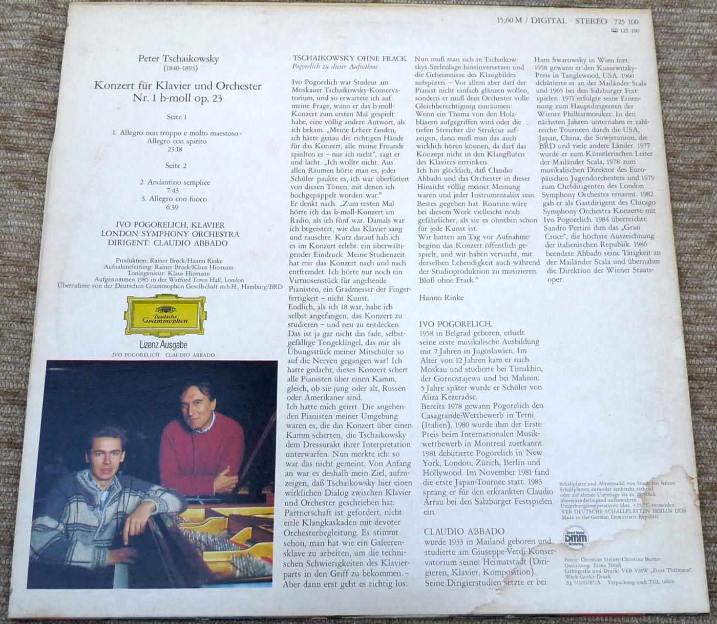 Gut erhaltene und gewaschene LP aus der DDR. Das ist die erste LP einer DMM (Direkt Digital Mastering) Platte der DDR. Peter Tschaikowsky - Konzert für Klavier und Orchester Nr. 1 b-moll op. 23, Es spielt das London Symphonic Orchestra, Leitung Claudio Abbado. |