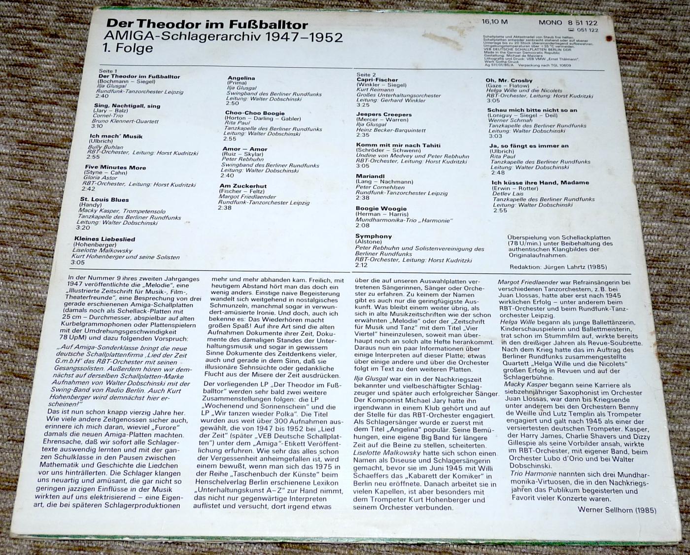 Gut erhaltene, gewaschene LP aus der DDR. Amiga-Schlagerarchiv, Teil 1 - Der Theodor im Fußballtor ist eine Sammlung von Originalaufnahmen aus den Jahren 1947 - 1952. |
