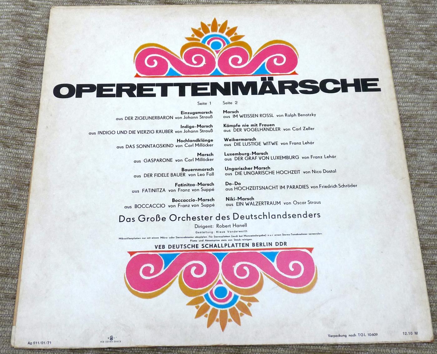 Gut erhaltene, gewaschene LP aus der DDR. Eine Sammlung von Märschen aus verschiedenen Operetten mit dem Großen Orchester des Deutschlandsenders, Dirigent Robert Hanell. |