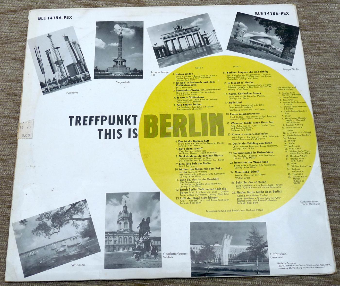 Gut erhaltene, gewaschene LP von Telefunken. Treffpunkt - This is Berlin ist eine Zusammenstellung von alten Berliner Liedern. |