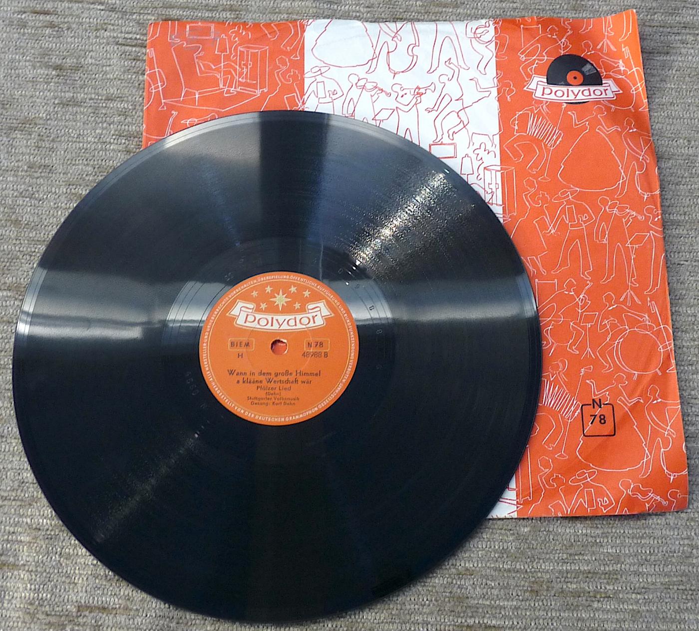 Gewaschene Schellackplatte in guter Erhaltung und fast ohne Knistern. Ich bin vun de Palz; Wan in dem große Himmel a klääne Wertschaft wär - Stuttgarter Volksmusik, Kurt Dehn. |