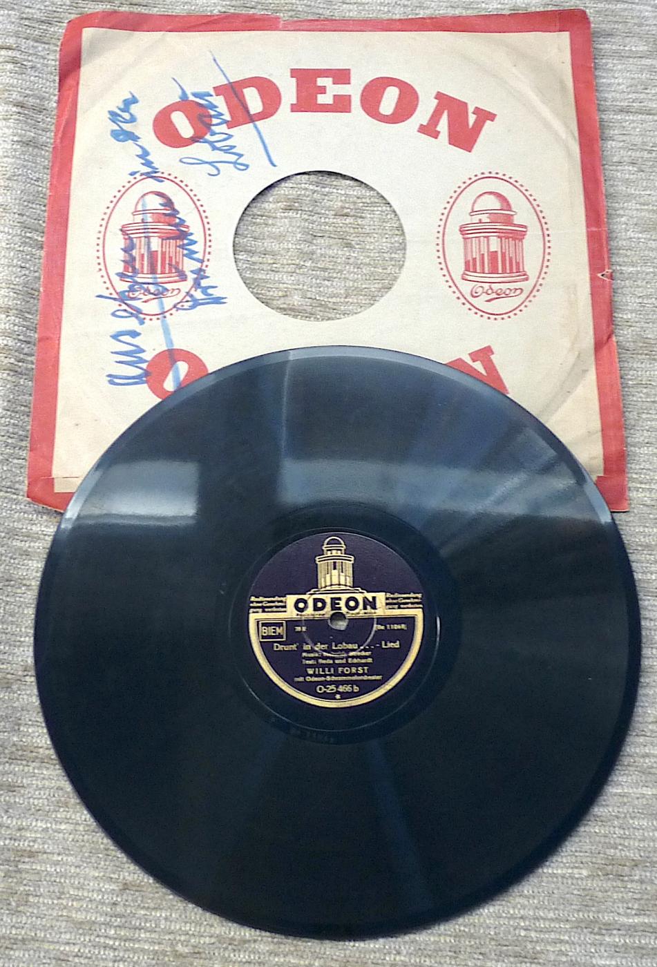 Gewaschene Schellackplatte in guter Erhaltung und fast ohne Knistern. Wie ein Wunder kam die Liebe, Drunt in der Lobau - Willi Forst mit dem Odeon-Schrammelorchester. Hülle mit Beschriftung. |
