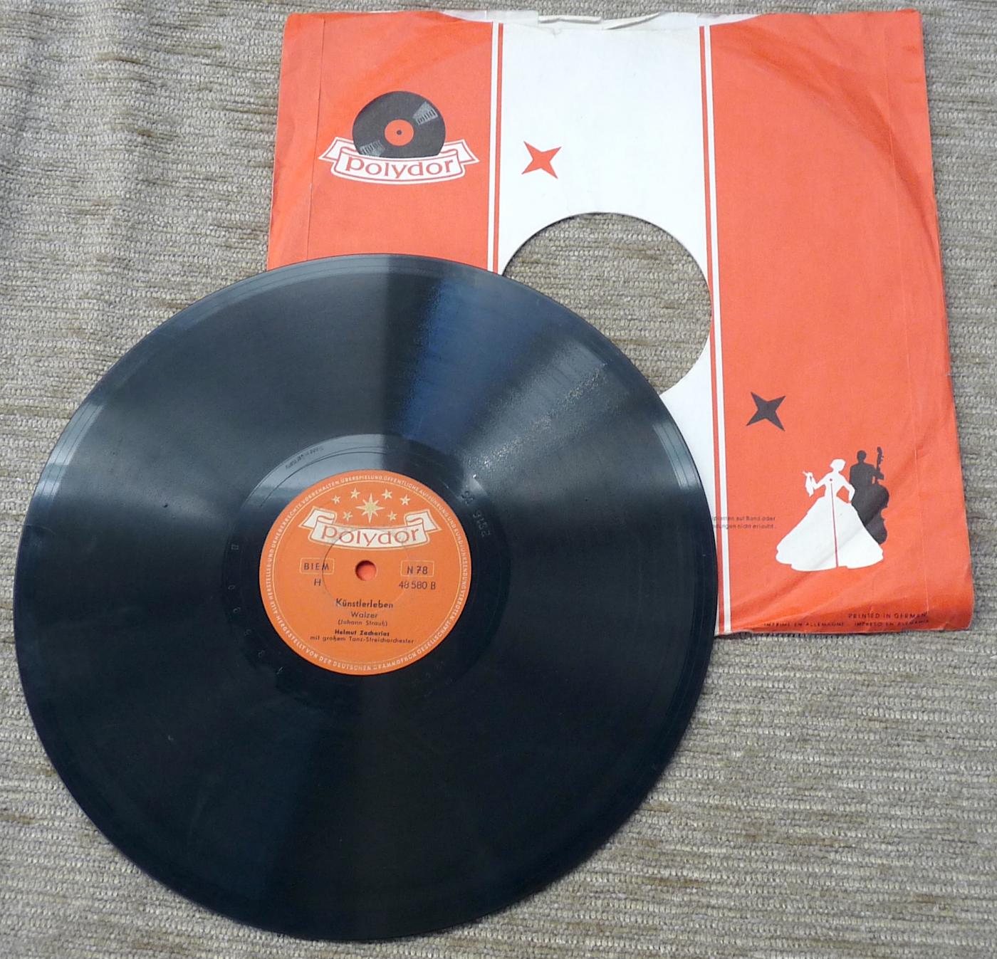 Gewaschene Schellackplatte in guter Erhaltung und fast ohne Knistern. Walzer von Johann Strauß: Wiener Blut; Künstlerleben - Helmut Zacharias mit großem Tanz-Streichorchester. |