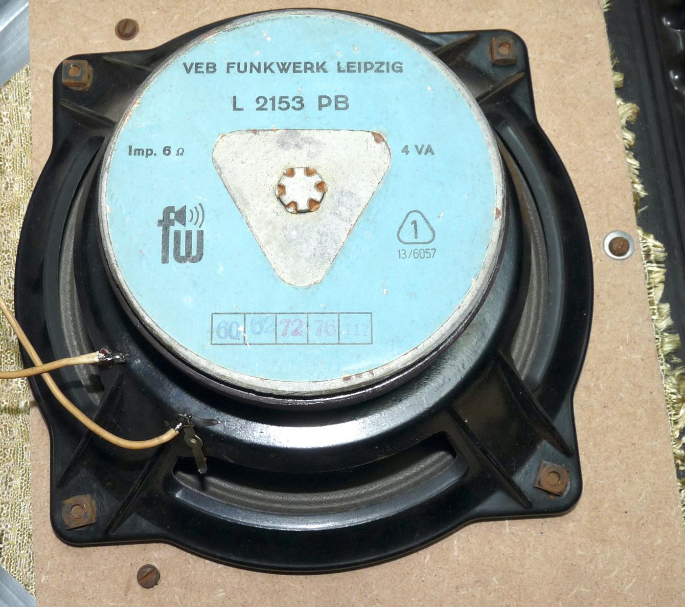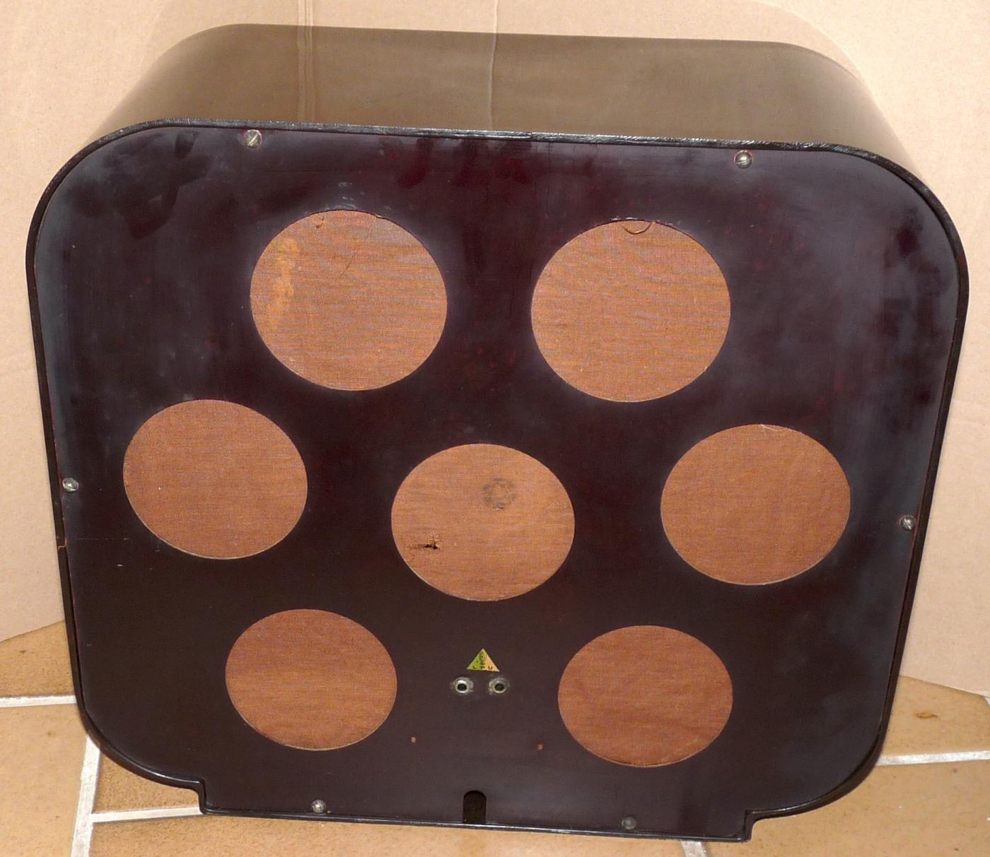 Formschöner Saba-Lautsprecher, Typ Dino. Das Gehäuse ist in sehr gutem Zustand. Der Stoff an der Frontseite und der Lautsprecher sind nicht original. |